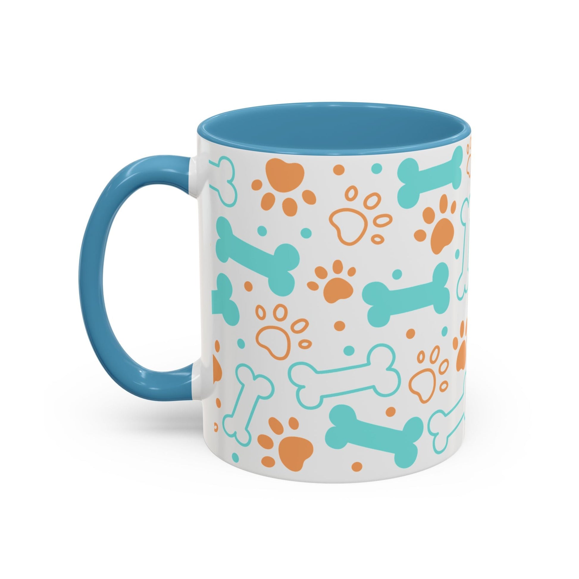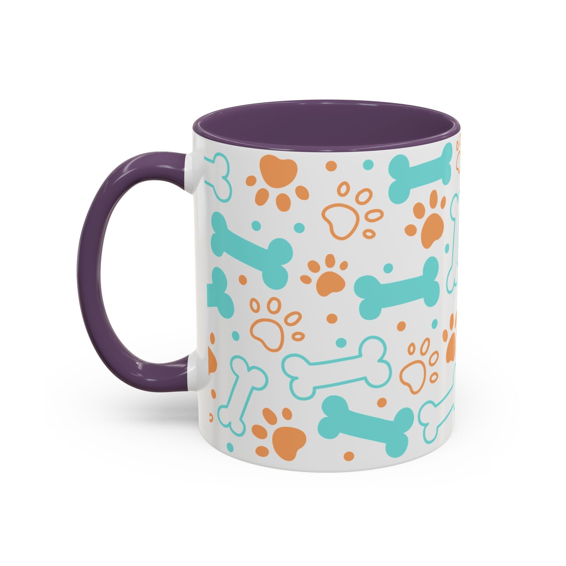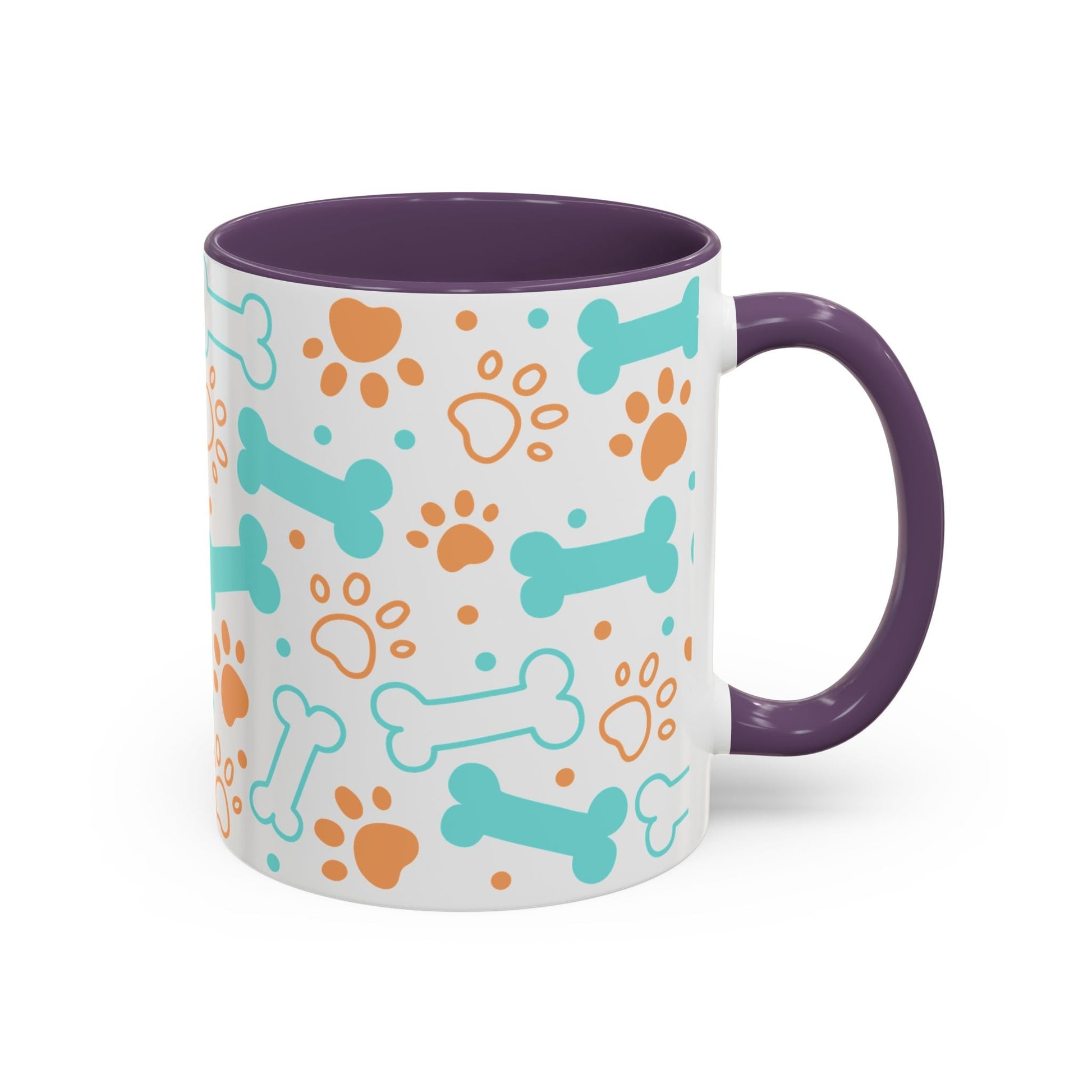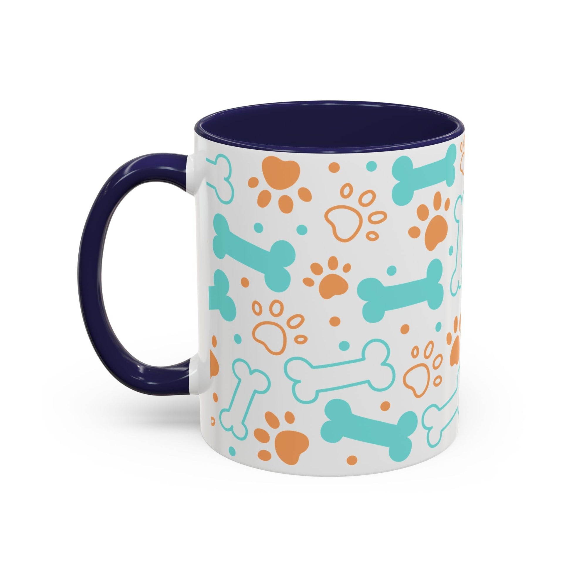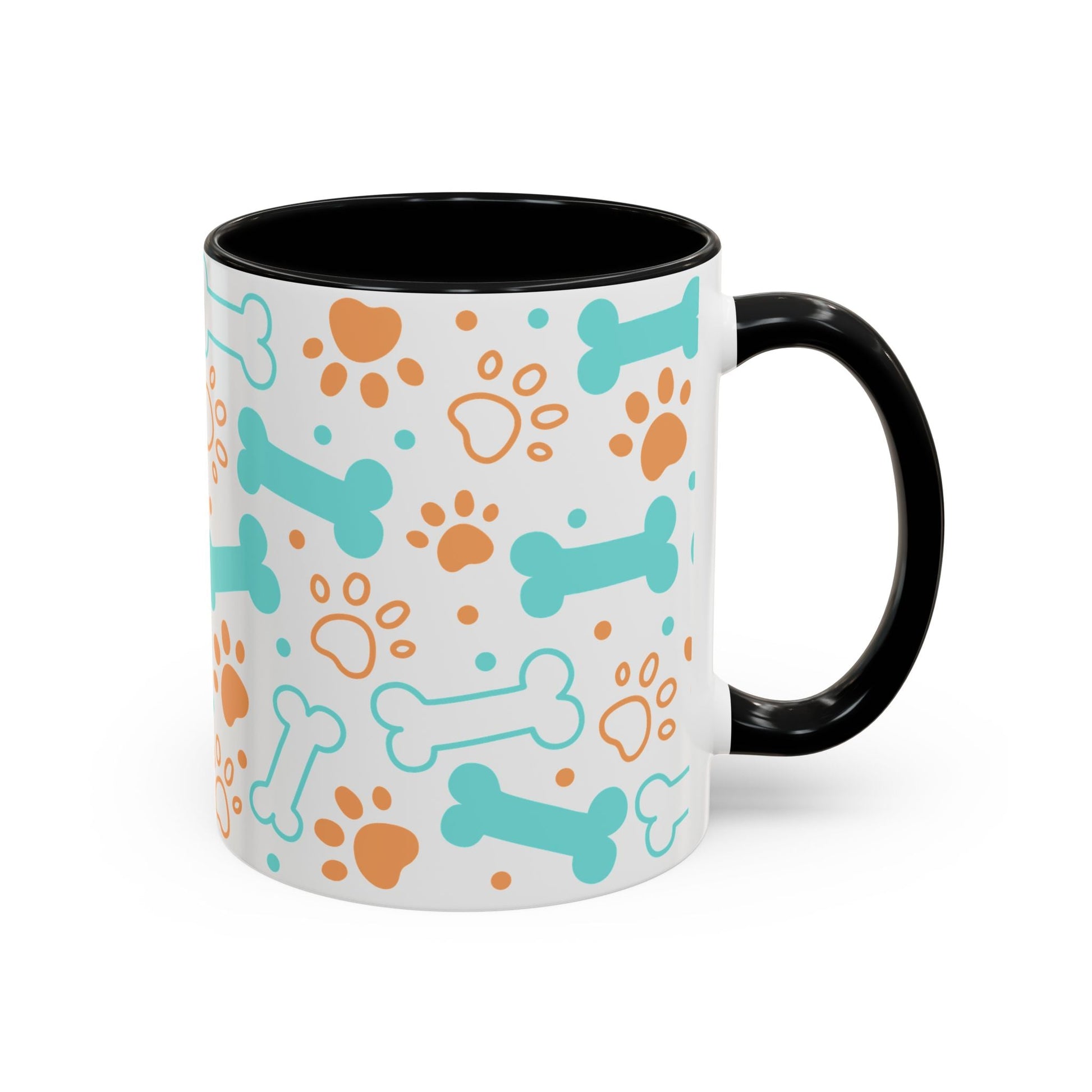 Puppy Pattern Accent Coffee Mug - Perfect Gift for Dog Lovers. This vibrant mug is microwave and dishwasher safe, with a glossy finish and eye-catching color contrast. Ideal for dog lovers, this mug is perfect for enjoying a cozy cup of coffee or tea during the holidays.
