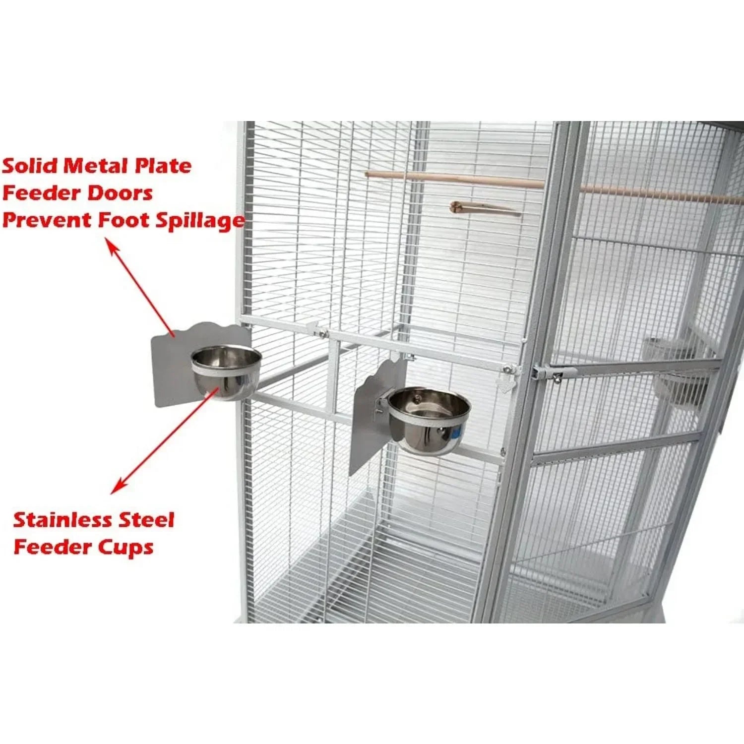 - 【Feeder Doors With Stainless Cups】With 4 Swivel Solid Metal feeder doors to prevent spillage. Include 4 Stainless Steel Feeder Cups. 【Two Wooden Perches Included.】