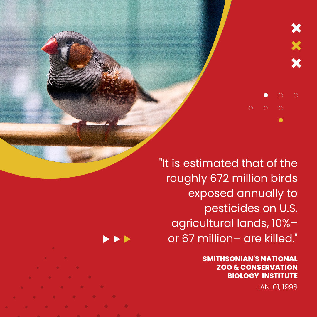 For Wild and Companion Birds. It is estimated by the Smithsonian's National Zoo & Conservation Biology Institute that roughly 672 million birds are exposed annually to pesticides on US agricultural lands. 10% or 67 million are killed. We are here to make a difference by providing products free of chemicals.